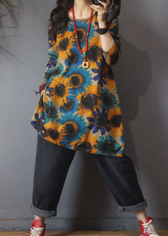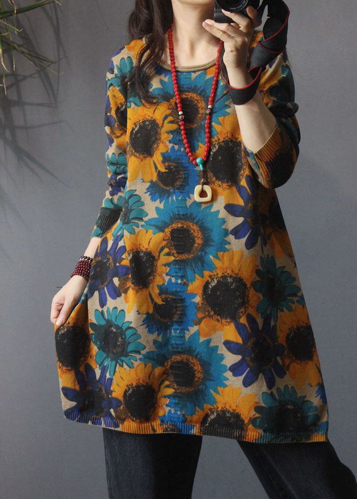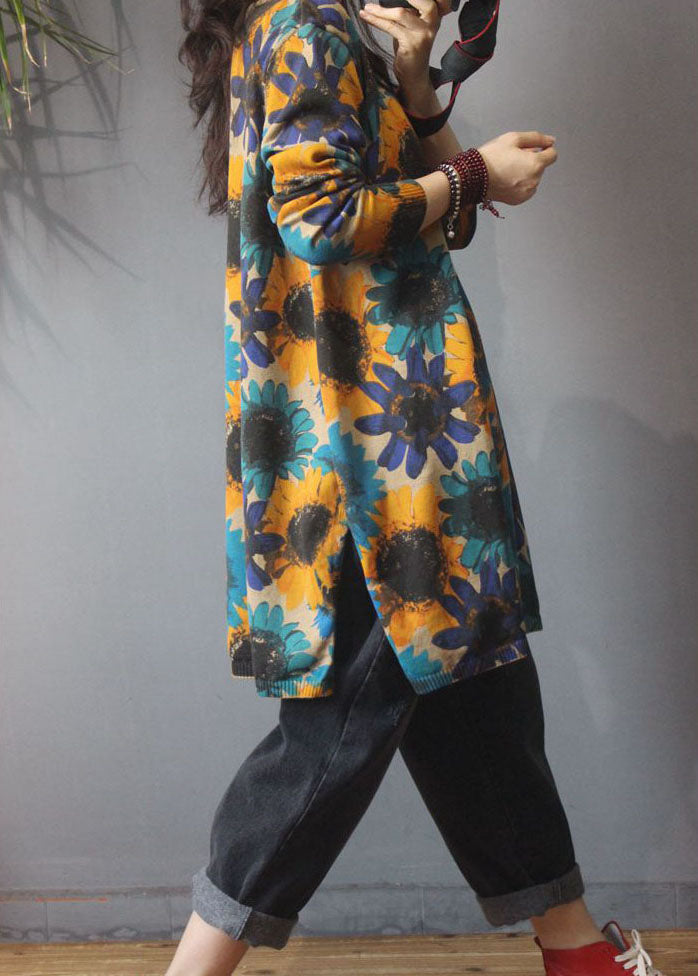 Classy Khaki O-Neck Print side open Fall Knit Knit Long Sweater