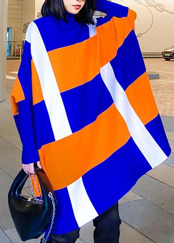French Blue Turtleneck Patchwork Fall Striped Knitwear Dress