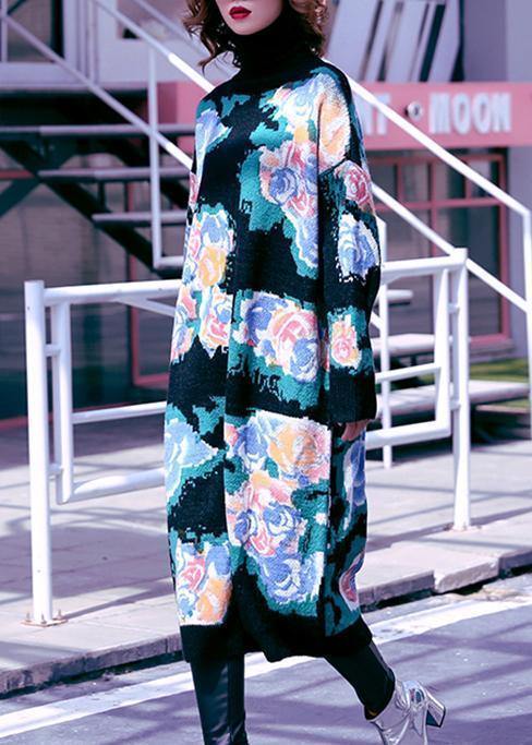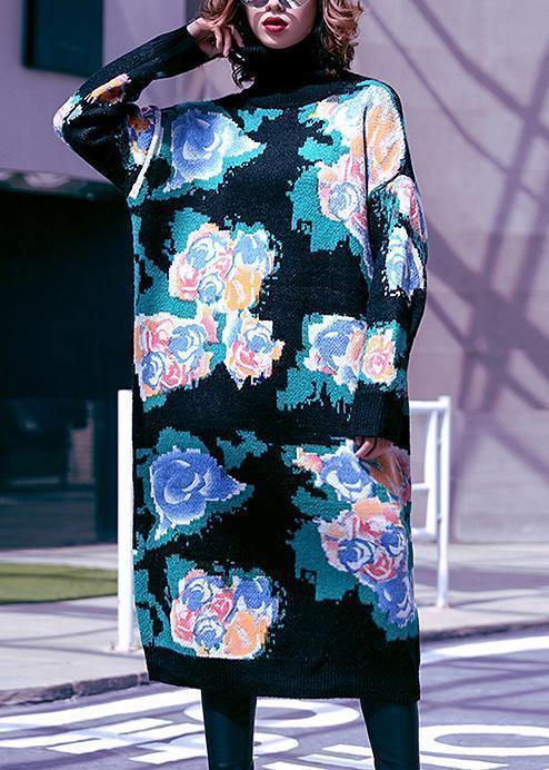 Women high neck Sweater Aesthetic plus size black print Fuzzy knit dress